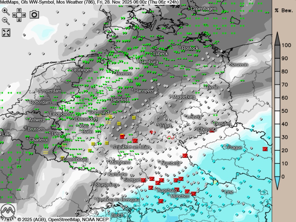 Am Freitag zeigt sich der Himmel überwiegend stark bewölkt, dabei fällt im Nordwesten und in der Landesmitte zeit- und gebietsweise etwas Regen oder Sprühregen. Im Südosten gibt es neben zährem Hochnebel auch zeitweise Auflockerungen, es bleibt trocken.