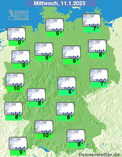Heute bleibt es verbreitet bedeckt, dabei fällt zeitweise, zum Teil auch länger anhaltender Regen. Gegen Abend zeigen sich im Westen und Nordwesten mögliche Auflockerungen, dann bleibt es hier weitgehend trocken. Die Temperatur steigt auf 6 Grad in Erfurt und bis 10 Grad in Köln. An den Küsten weht ein teils stürmischer Wind.