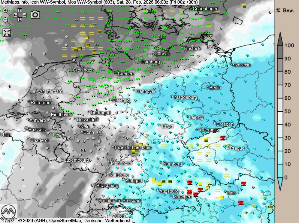 Die Wetter- und Temperaturkarte für Samstagfrüh (06:00 Uhr) sowie die 24-Stunden-Regenmengen für Samstag nach ICON: