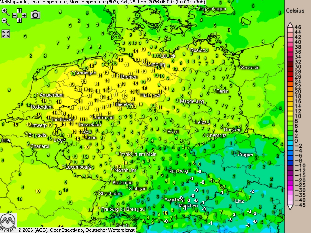 Die Temperaturen erreichen am Nachmittag Höchstwerte um 11 Grad an der Nordseeküste und um 19 Grad im Südosten.