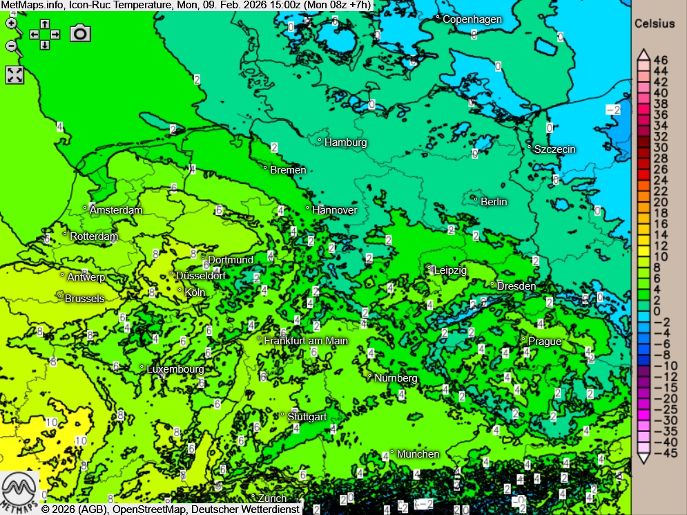 Die Temperatur- und Wetterkarte nach ICON-RUC für 15:00 Uhr: