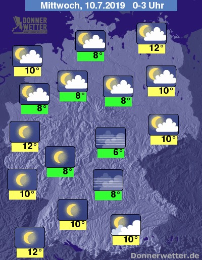 In der Nacht zeigt sich der Himmel über der Nord- und Osthälfte sowie am Alpenrand meist locker bewölkt, im Süden und Westen funkeln die Sterne von einem meist wolkenlosen Himmel. Schauer sind in der Nacht nicht zu erwarten.