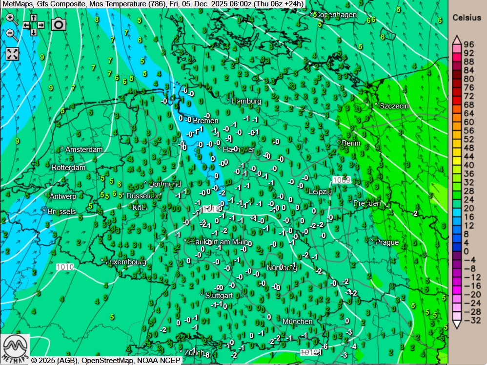 Die Strömungs- / Temperaturkarte sowie die Wetterkarte für Freitagmorgen nach GFS:
