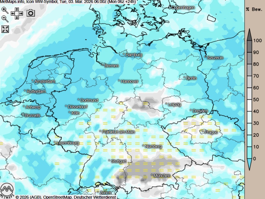 Am Dienstag zeigt sich der Himmel über dem Süden und der Mitte anfangs noch nebelig-trüb; sonst ist es heute verbreitet sonnig. Am Nachmittag nimmt die Bewölkung über dem Norden zu, es bleibt aber niederschlagsfrei.