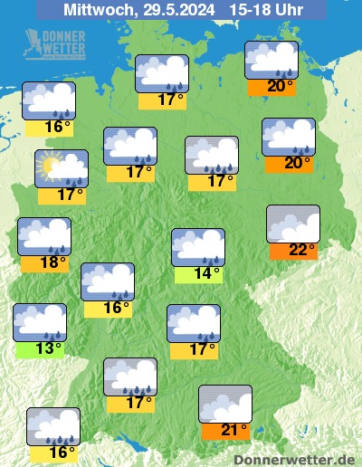 In den Nachmittagsstunden zeigt sich der Himmel verbreitet stark bewölkt oder bedeckt, dabei erreichen Regengebiete auch die südöstlichen Landesteile. Im Nordwesten und der Mitte fallen die Niederschläge dann zumeist als Schauer, lokal sind auch kräftige Gewitter möglich.