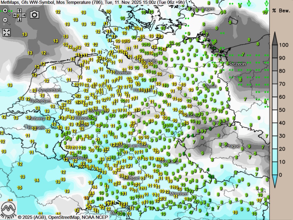 Am Dienstagnachmittag lockern die Wolken über dem Nordosten zunehmend auf und es bleibt meist niederschlagsfrei. Über der breiten Mitte gibt es in den nächsten Stunden einen Mix aus Sonne und wechselnder Bewölkung; im äußersten Süden und Südwesten ist es auch längere Zeit heiter oder sonnig.