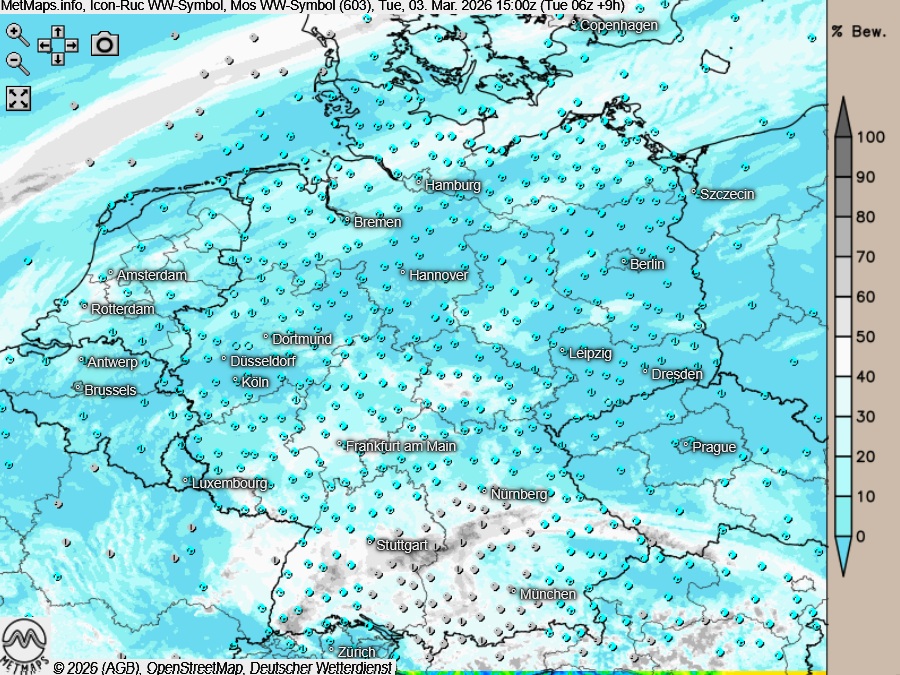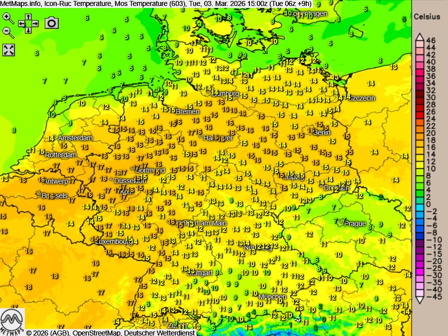Die Temperatur- und Wetterkarte (15:00 Uhr) nach ICON-RUC: