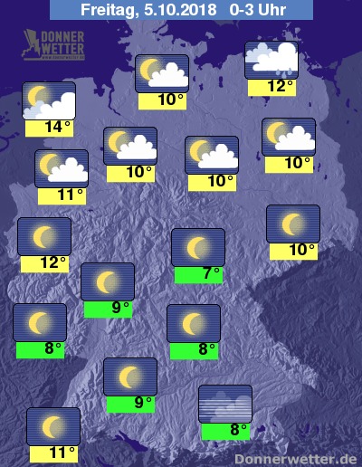 In der Nacht ist es in der Nordhälfte zumeist noch bewölkt, im Ostseeumfeld können auch einzelne Schauer fallen. Später klart es hier aber regional auch auf. In den übrigen Landesteilen bleibt der Himmel meist sternenklar, entlang der Donau sowie am Alpenrand kann sich stellenweise auch Nebel bilden.