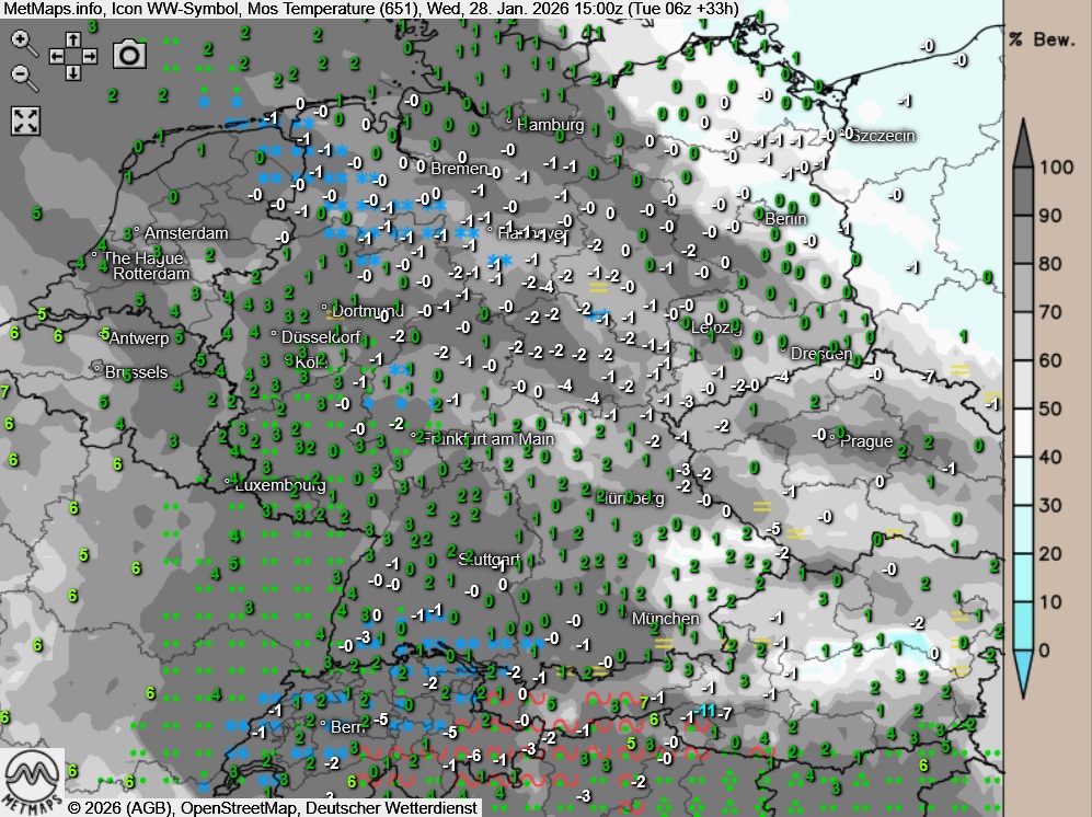 Die Temperaturen erreichen im Norden und Osten Höchstwerte um 0 bis 2 Grad, sonst 3 bis 6 Grad.