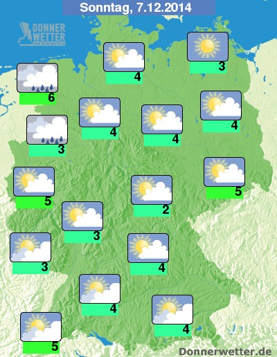 Am Sonntag halten sich zumeist viele Wolken am Himmel, oft ist es neblig-trüb oder bedeckt, nur hier und da lockert die Bewölkung auch mal etwas auf. Am Alpenrand fällt dabei noch gelegentlich weiterer Schnee, sonst ist es zunächst meist trocken, bevor zum Nachmittag aus Nordwesten Regen aufkommt, der sich bis zum Abend etwa zu einer Linie Rheinland bis zur schleswig-holsteinischen Ostseeküste ausbreitet. Südöstlich davon bleibt es dagegen weitgehend trocken. Die Temperatur steigt auf 2 Grad am Vogelsberg und bis auf etwas mildere 6 Grad an der nördlichen Ems.