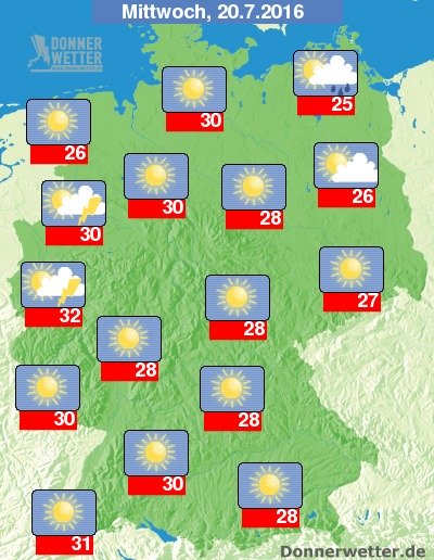 Erst ab dem Nachmittag sind im Westen gebietsweise Schauer und örtliche Gewitter möglich. Vereinzelne Schauer können sich auch im Ostseeumfeld bilden. Im übrigen Land bleibt es trocken bei Höchstwerten von 25 Grad in Rostock und 32 Grad in der Kölner Bucht.