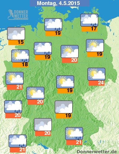 Am Montag bleibt es vor allem im Süden, aber auch im gesamten Küstenumfeld weitgehend stark bis dicht bewölkt und es kann auch immer wieder Regen fallen. In den übrigen Landesteilen gibt es häufig einen Wechsel aus Sonne und teils dichten Wolken, dazu bleibt es aber meist trocken. Die Temperatur steigt auf kühle 15 Grad an der Nordsee und bis 24 Grad in Dresden.