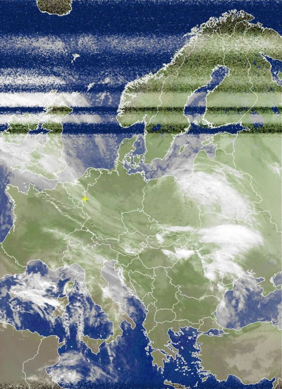 Das Satellitenfoto von heute Nachmittag zeigt Europa unter häufig einigen, teils auch dichten Wolken. Zwischen einem Tief westlich der Britischen Inseln und einem weiteren über dem Osten von Polen erstreckt sich ein Regenband. Von Irland, über die Südhälfte von England, Benelux, die breite Mitte von Deutschland, nach Polen bis zu den Baltikumstaaten regnet es am Nachmittag oft auch langanhaltend.