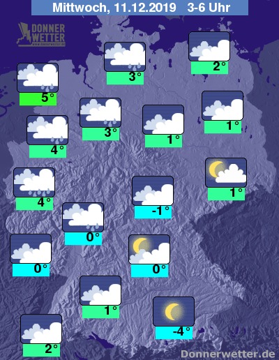 In der folgenden Nacht ziehen von Nordwesten her kompakte Wolken und Regen bis etwa über die Nordwesthälfte Deutschlands. Dagegen bleibt es über der Südosthälfte des Landes bis zum Morgen noch trocken, jedoch nimmt auch hier die Bewölkung Stück für Stück zu. Die Temperatur sinkt auf 5 Grad im Emsland und bis -4 Grad in Rosenheim.