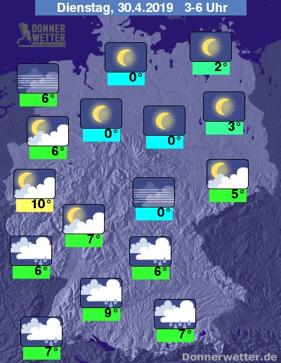 In der kommenden Nacht spaltet sich das Land beim Wetter, denn die Nordhälfte zeigt sich meist sternenklar, wohingegen die Südhälfte meist dicht bewölkt und Schauer oder Regen mit sich bringt. Dennoch sind Auflockerungen z.B. um Dresden und des Niederrheins zu erwarten. Die Temperaturen fallen auf 0 bis 10 Grad.
