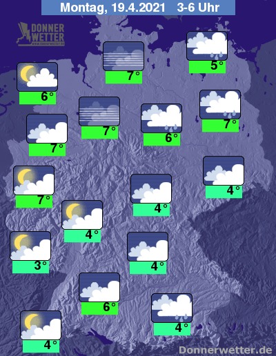 In der Nacht zum Montag lockert es vor allem in den westlichen Landesteilen vielerorts auf, sonst ist es aber überwiegend stark bewölkt. Im Osten, Nordosten und Südosten fällt noch regional etwas Regen, sonst bleibt es weitgehend trocken. Die Temperatur sinkt auf 7 Grad im Norddeutschen Tiefland und bis 3 Grad im Saargau.
