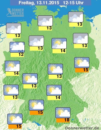 Die Temperaturen erreichen Werte um 12 Grad C in Münsterland bis 18 Grad C in Oberbayern.
