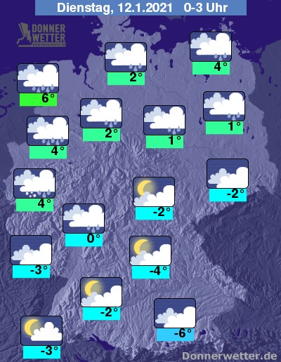 In der Nacht auf Dienstag verdichten sich die Wolken im Süden immer weiter, von Nordwesten breiten sich zudem neue Niederschlagsgebiete aus, die vor allem dem Norden und Westen Regen, höheren Lagen auch Schneeregen oder Schnee bringen. Der Wind frischt in den Nachtstunden auf und weht teils böig aus Südwest, an den Küsten und auf den Gipeln sind auch stürmische Böen oder Sturmböen möglich.