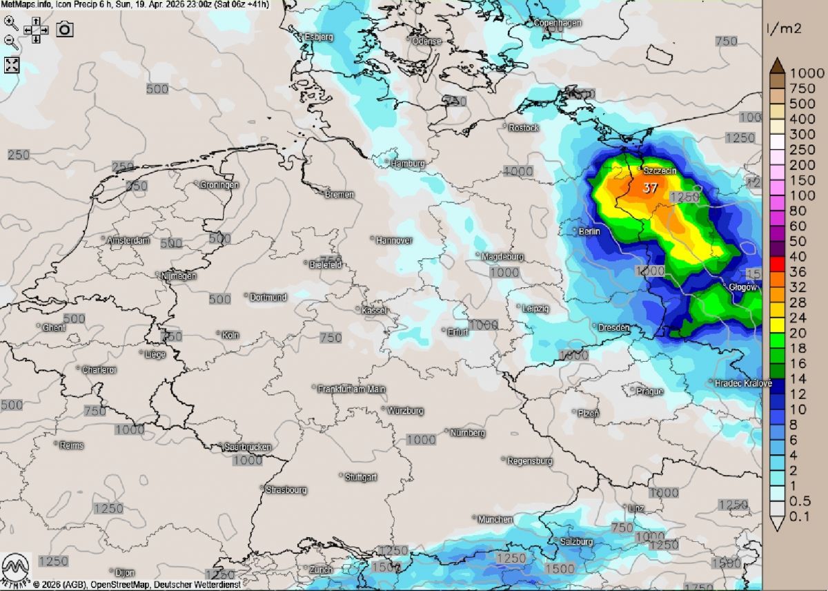 Die Wetter- und Temperaturkarte für Sonntagnachmittag (15:00 Uhr) sowie die 6-Stunden-Regenmengen bis 23:00 Uhr nach ICON: