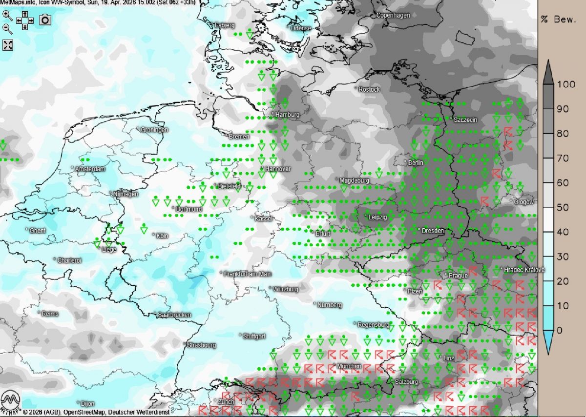Am Sonntagnachmittag zeigt sich der Himmel über dem Süden und Südosten stark bewölkt, dabei muss zeitweise mit Schauern und einzelnen Gewittern gerechnet werden. In den übrigen Landesteilen ist es teils stark, teils aufgelockert bewölkt und es fallen zeit- und gebietsweise Schauer.