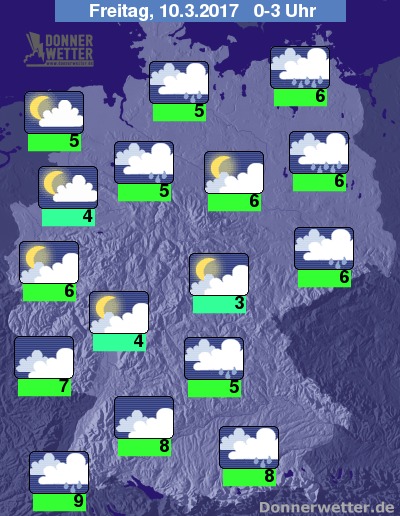 Dabei liegen die Höchstwerte am frühen Abend zwischen 9 Grad in Franken und 13 Grad am Niederrhein.