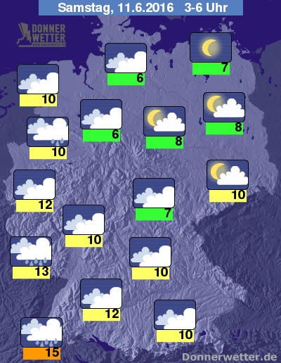 In der folgenden Nacht ist es zunächst noch verbreitet leicht oder aufgelockert bewölkt und trocken, im Südwesten sind bei oft starker Bewölkung einzelne Schauer möglich, im Nachtverlauf nimmt die Bewölkung über der Südwesthälfte deutlich zu, dabei fällt vom Süden, über den Südwesten bis in den äußeren Westen der Republik gebietsweise Regen, sonst bleibt es aber trocken. Die Temperatur sinkt auf 15 Grad in Freiburg und etwa 7 Grad an der Müritz.