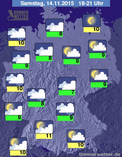 In den späteren Abendstunden bestimmen überwiegend dichte Wolken das Himmelsbild. Lockere Wolkenfelder ziehen vior allem durch die Süd- und Osthälfte des Landes. Einzelne Schauer sind vor allem am Mittelrhein sowie an der Nordseeküste möglich. Die Temperaturen liegen bei Werten um 7 bis 11 Grad C.