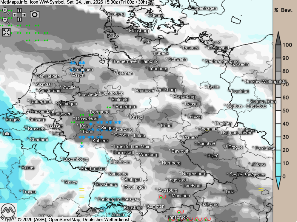 Am Samstagnachmittag breitet sich von Westen her dichte Bewölkung bis in die Landesmitte aus. Dabei fällt zeitweise etwas Regen oder Schnee. Besonders in Richtung Nordwesten kann es örtlich auch zu gefrierendem Regen kommen, Glatteis ist dort nicht ausgeschlossen.