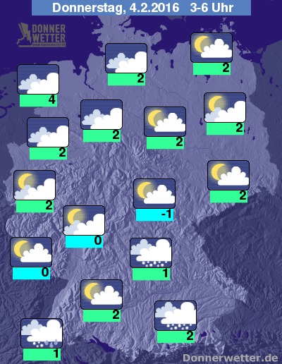 In der Nacht zum Donnerstag fällt vor allem im Alpenvorland noch häufig Schnee oder auch Schneeregen, dabei besteht Glättegefahr! In den anderen Landesteilen ist es unterschiedlich, häufig auch stark bewölkt, jedoch mehrheitlich trocken. Die Temperatur sinkt auf 4 Grad in Ostfriesland und bis -1 Grad im Vogtland. An den Küsten weht zum Teil starker Wind.