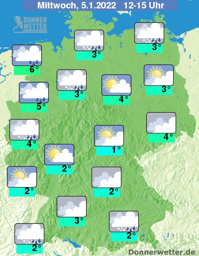 Heute Nachmittag ist es größtenteils stark oder dicht bewölkt. In einem Streifen vom Saarland bis nach Brandenburg zeigen sich vorübergehend auch Auflockerungen. Sonst und im übrigen Land fällt gebietsweise Regen oder Schnee. Im Süden fallen die Niederschläge meist als Schnee. Die Temperatur liegt bei 1 Grad im Grabfeld und bis 6 Grad an der Nordsee. Im Norden weht ein oft stürmischer Wind.