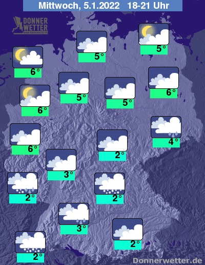 Heute Abend ist es verbreitet stark bewölkt oder bedeckt. Im Norden zeigen sich auch gebietsweise Auflockerungen. Im Süden fällt vielerorts Schnee oder Schneeregen, sonst bleibt es meist trocken. Die Temperatur liegt bei 2 Grad in Jena und bis 6 Grad in Meppen. An der See weht ein oft stürmischer Wind.