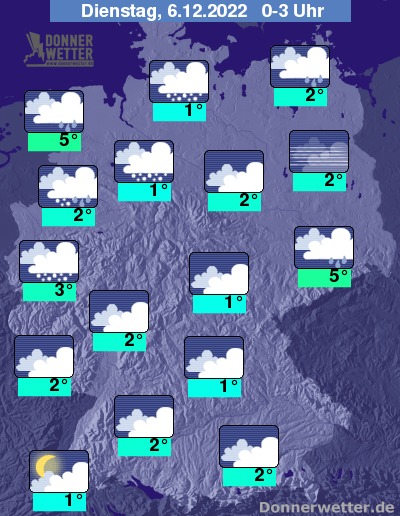 In der Nacht auf Dienstag fällt vor allem von NRW bis zur Ostsee immer wieder Regen, Schneeregen oder Schnee, im Südosten des Landes regnet es zeitweise auch kräftiger. Sonst bleibt es unter einer meist geschlossenen Wolkendecke überwiegend trocken, einzelne Auflockerungen und Nebelbildung gibt es lokal im Süden und Südwesten.