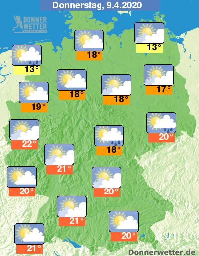 Die Höchsttemperaturen liegen im Norden zwischen 13 und 19 Grad, am kühlsten bleibt es dabei an den Küsten. Im Süden und Westen werden meistens Werte zwischen 20 und 23 Grad erreicht.