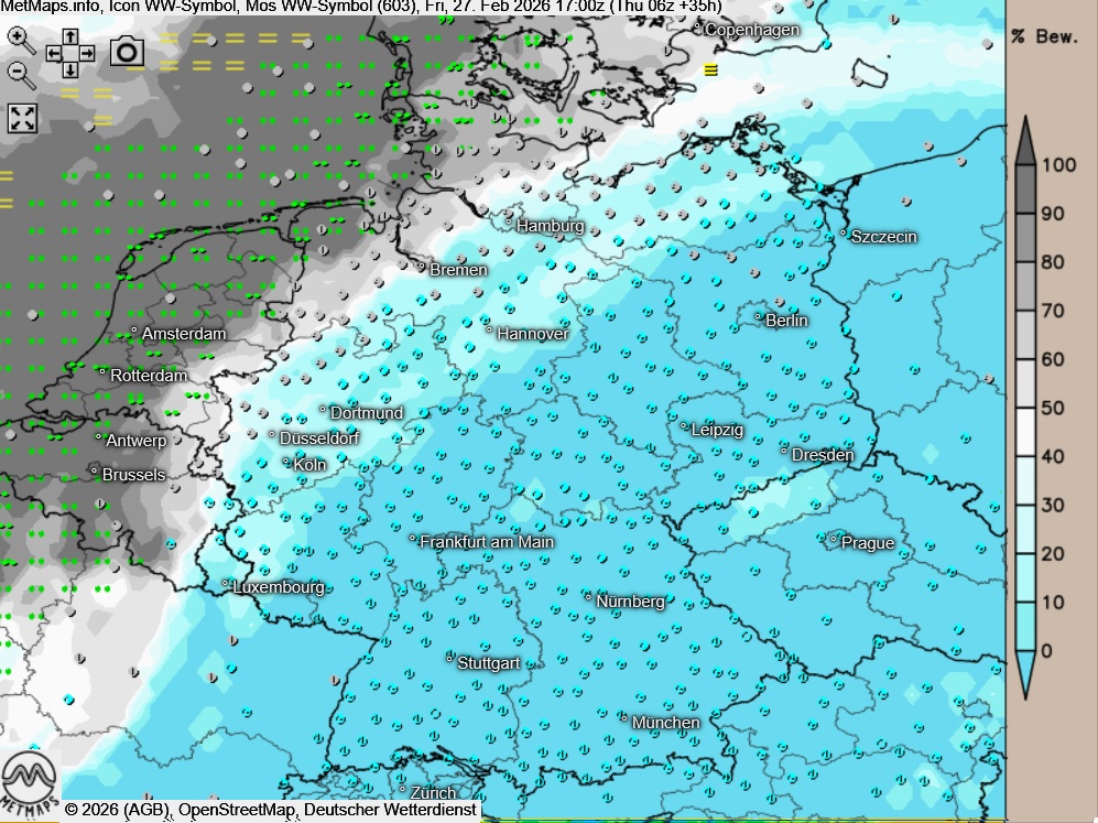 Die Temperatur- und Wetterkarte für Freitagnachmittag (15:00 Uhr) sowie die Sechs-Stunden-Regenmengen bis 00:00 Uhr nach ICON:
