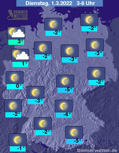 In der Nacht zum Dienstag ist der Himmel über dem Land verbreitet sternenklar. An Niederrhein und Ems ziehen gebietsweise einige Wolken auf, es bleibt aber überall trocken. Die Tiefstwerte liegen bei 3 Grad in Emden und bis -5 Grad in Jena.