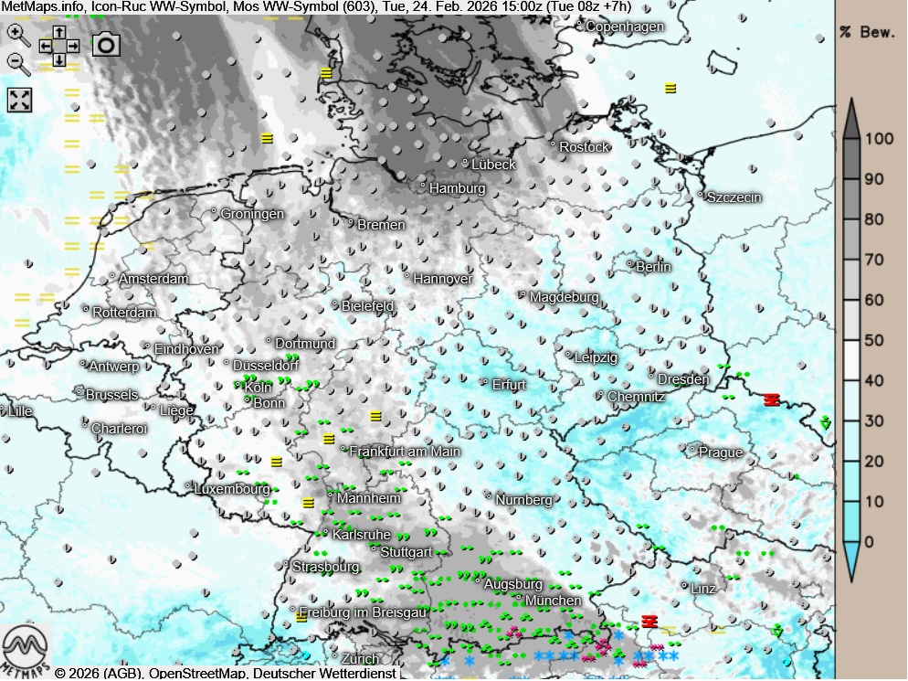 Am Dienstagnachmittag zeigt sich der Himmel verbreitet stark bewölkt oder es ist bedeckt, dabei fällt vor allem im Süden und Westen zeitweise Regen, in Alpennähe auch Schnee. In der Nord- und Osthälfte sowie in der Landesmitte bleibt es am Nachmittag bei temporären Auflockerungen weitgehend niederschlagsfrei.