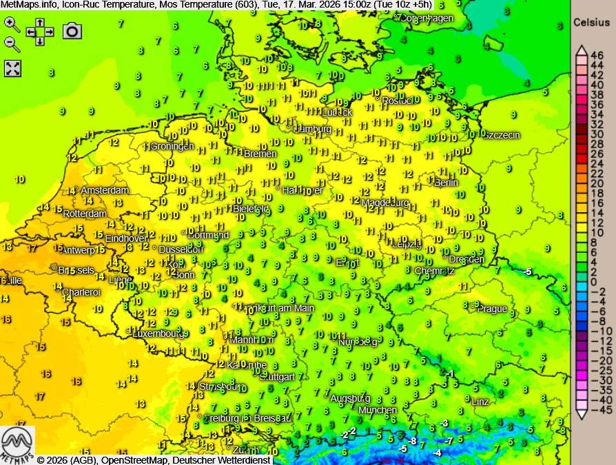 Die Wetter- und Temperaturkarte für Dienstagnachmittag (15:00 Uhr) nach ICON-RUC: