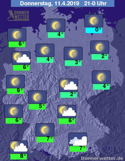 Die Temperaturen liegen vor Dämmerungsbeginn zwischen 6 Grad im Nordosten und 12 Grad im Südwesten.