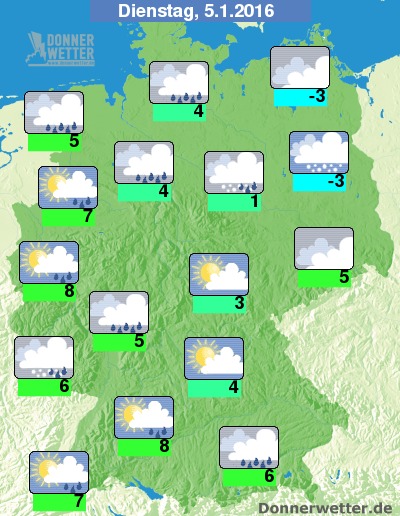 Heute bleibt es im Norden stark bewölkt und es fällt immer wieder Regen, Schneeregen, Schnee oder auch gefrierender Regen, dabei ist es zum Teil sehr glatt! Im übrigen Land ist es auch meist stark, gebietsweise aber auch aufgelockert bewölkt, es fällt zeitweise Regen, seltender auch Schneeregen. Die Temperatur steigt auf -3 Grad in Berlin und bis 8 Grad in der Kölner Bucht. An den Küsten weht teils starker Wind.