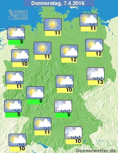 Am Donnerstag halten sich im Süden zumeist dichte Wolken, dazu fällt zeitweise Regen, in den anderen Landesteilen ist es zum Teil heiter bis sonnig, teilweise ziehen aber auch dichte Wolken durch, dabei sind einzelne Schauer möglich. Die Temperatur steigt auf 9 Grad in Mittelfranken und bis 13 Grad in der Lausitz.