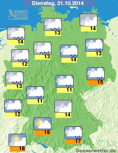 Heute ist es im Süden zunächst noch häufig freundlich und trocken, sonst ziehen aber bereits verbreitet dichte Wolken durch und vielerorts kann es kräftig regnen. Regional kann es auch zu kurzen Gewittern kommen. Dazu frischt der Wind spürbar auf und es muss mit kräftigen bis stürmischen Böen gerechnet werden. Im Nordseeumfeld und in den Mittelgebirgen sind vereinzelt starke Sturmböen möglich. Die Temperatur steigt auf 11 Grad im Grabfeld und bis 17 Grad in Augsburg.