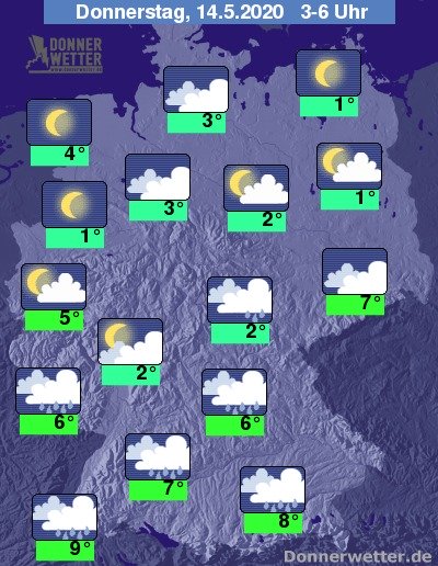 In der Nacht auf Donnerstag bleibt es in der Nordhälfte Deutschlands bei wechselnder Bewölkung häufig trocken, im Küstenumfeld funkeln die Sterne auch von einem wolkenlosen Himmel. Der Süden des Landes verbleibt auch in der Nacht unter einer meist geschlossenen Wolkendecke, dabei fällt immer wieder Regen.