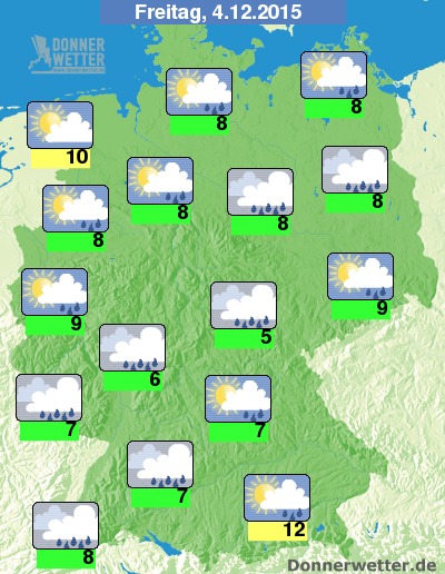 Die Temperaturen steigen auf Höchstwerte um 5 Grad C im Thüringer Wald und um 12 Grad C im Alpenvorland.