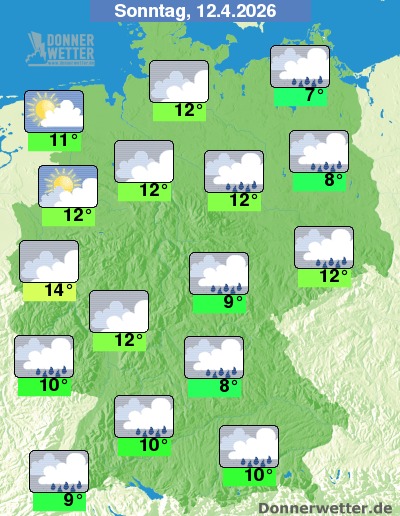 Am Sonntag hält sich den Tag über verbreitet eine geschlossene Wolkendecke. Im Nordwesten sowie im Südosten der Republik sind die Chancen für Auflockerungen noch am höchsten, hier und über dem größten Teil der Nordwesthälfte des Landes bleibt es auch zumeist trocken. Im übrigen Bundesgebiet fällt hingegen gebietsweise Regen. Die Höchstwerte erreichen etwa 7 Grad direkt an der Ostsee und bis 14 Grad im Rheinland.