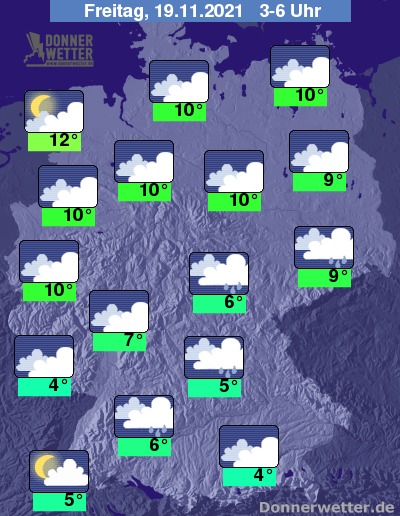 In der folgenden Nacht bleibt der Himmel bedeckt und es fällt auch gelegentlich etwas Regen, häufig ist es auch neblig-trüb. Die Temperatur sinkt auf 12 Grad in Cuxhaven und bis 4 Grad in Saarbrücken. An den Küsten weht ein teils stürmischer Wind.