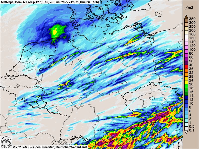 Für das südliche Bayern gehen die Modell teils von 12-Stunden-Regenmengen knapp unter 100 l/m² aus.
