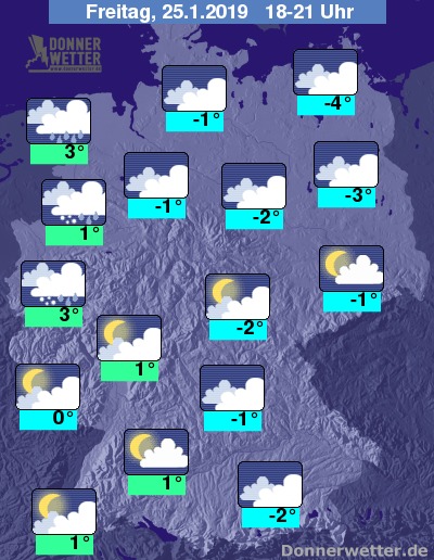 Die Temperaturen liegen vor Beginn der abendlichen Dämmerung bei -4 Grad im Nordosten und +1 Grad im Rhein-Main-Gebiet. In den Ballungsgebieten des Westens und an der Ems können bereits schon +3 Grad erreicht werden.