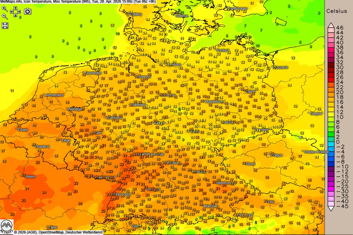Die Wetter- und Temperaturkarte für 15:00 Uhr nach ICON: