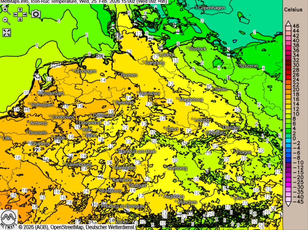 Die Temperaturen erreichen heute Höchstwerte um 7 Grad im Nordosten und um 18 Grad im Rheinland.