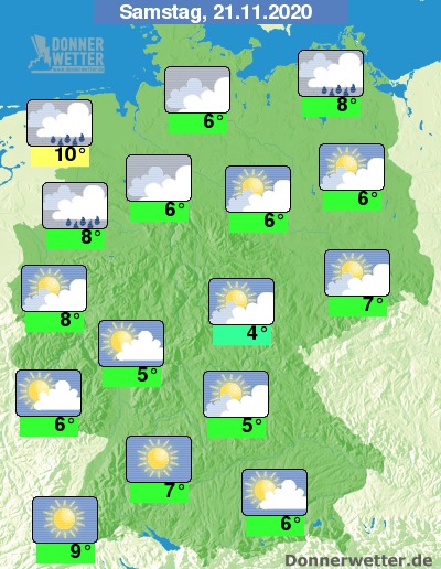 Heute bleibt es im Norden bedeckt und es fällt örtlich Regen. Im übrigen Bundesgebiet ist es zumeist stark, teils auch aufgelockert bewölkt. Im Süden und über Sachsen ist es vor allem vormittags oft heiter bis sonnig. Es bleibt trocken bei 4 bis 10 Grad.